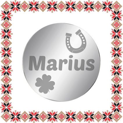 Martisor tip brosa gravata cu trifoi cu patru foi, potcoava si numele Marius, pe baza in forma de banut de inox de culoare argintie. O brosa special creata pentru el cu care nu poti da gres, un mod original de a-i darui primavara. Martisor realizat din otel inoxidabil, un material rezistent care nu isi modifica culoarea sau aspectul in timp si care straluceste elegant, ca o mica bijuterie. Gravam cu bucurie martisoare special create pentru oamenii dragi din viata ta!