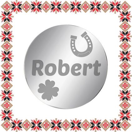 Martisor tip brosa gravata cu trifoi cu patru foi, potcoava si numele Robert, pe baza in forma de banut de inox de culoare argintie. O brosa special creata pentru el cu care nu poti da gres, un mod original de a-i darui primavara. Martisor realizat din otel inoxidabil, un material rezistent care nu isi modifica culoarea sau aspectul in timp si care straluceste elegant, ca o mica bijuterie. Gravam cu bucurie martisoare special create pentru oamenii dragi din viata ta!