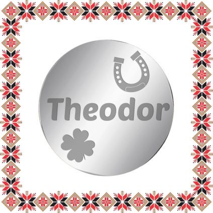 Martisor tip brosa gravata cu trifoi cu patru foi, potcoava si numele Theodor, pe baza in forma de banut de inox de culoare argintie. O brosa special creata pentru el cu care nu poti da gres, un mod original de a-i darui primavara. Martisor realizat din otel inoxidabil, un material rezistent ce nu isi modifica aspectul sau culoarea in timp, aspect ce face din acest martisor un accesoriu extrem de versatil, usor de asortat mai multor tinute vestimentare ce poate fi purtat si dupa sezonul de martisor atat pentru prinderea esarfei cat si ca accesoriu pe reverul sacoului/ paltonului sau pe geanta/ rucsac. Gravam cu bucurie martisoare special create pentru oamenii dragi din viata ta!
