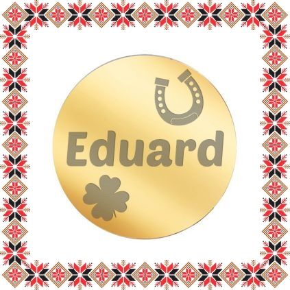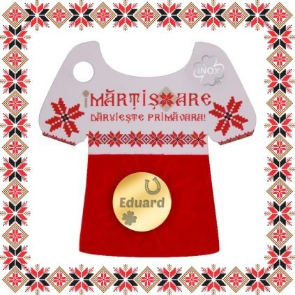Martisor tip brosa gravata cu trifoi cu patru foi, potcoava si numele Eduard, pe baza in forma de banut de inox de culoare aurie. O brosa special creata pentru el cu care nu poti da gres, un mod original de a-i darui primavara. Martisor realizat din otel inoxidabil, un material rezistent ce nu isi modifica aspectul sau culoarea in timp, aspect ce face din acest martisor un accesoriu extrem de versatil, usor de asortat mai multor tinute vestimentare ce poate fi purtat si dupa sezonul de martisor atat pentru prinderea esarfei cat si ca accesoriu pe reverul sacoului/ paltonului sau pe geanta/ rucsac. Gravam cu bucurie martisoare special create pentru oamenii dragi din viata ta!