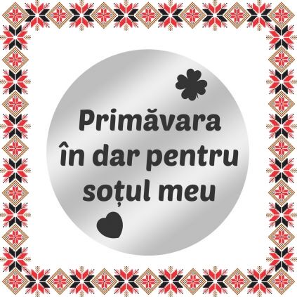 Martisor tip brosa gravata cu trifoi, inima si mesajul Primavara in dar pentru sotul meu, pe baza in forma de banut de culoare argintie. Martisor realizat din otel inoxidabil, un material rezistent care nu isi modifica culoarea sau aspectul in timp si care straluceste elegant, ca o mica bijuterie. Gravam cu bucurie martisoare special create pentru oamenii dragi din viata ta!
