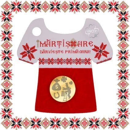 Martisor ambalat pe suport de carton de culoare bej in forma de camasa ie romaneasca cu motive traditionale, catifea rosie si mesajul Daruieste primavara. Snur de martisor si plic de hartie imprimat cu motive traditionale romanesti CADOU!