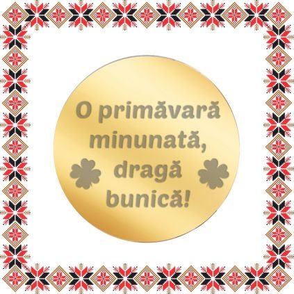 Martisor tip brosa gravata cu trifoi si mesajul O primavara minunata, draga bunica, pe baza in forma de banut de culoare aurie. Un martisor zambet pentru bunica, daruieste-l cu incredere. Martisor realizat din otel inoxidabil, un material rezistent ce nu isi modifica aspectul sau culoarea in timp, aspect ce face din acest martisor un accesoriu extrem de versatil, usor de asortat mai multor tinute vestimentare ce poate fi purtat si dupa sezonul de martisor atat pentru prinderea esarfei cat si ca accesoriu pe reverul sacoului/ paltonului sau pe geanta/ rucsac. Gravam cu bucurie martisoare special create pentru oamenii dragi din viata ta!