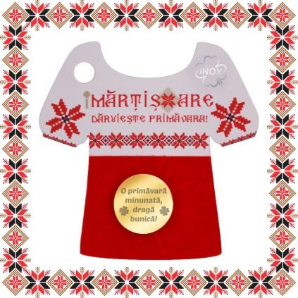 Martisor ambalat pe suport de carton de culoare bej in forma de camasa ie romaneasca cu motive traditionale, catifea rosie si mesajul Daruieste primavara. Snur de martisor si plic de hartie imprimat cu motive traditionale romanesti CADOU!