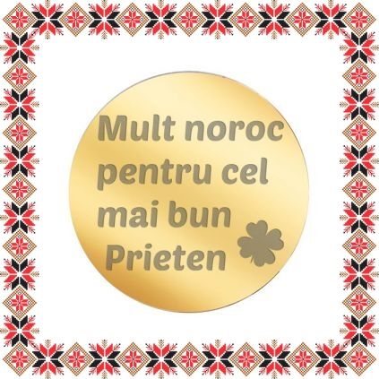 Martisor tip brosa gravata cu trifoi si mesajul Mult noroc pentru cel mai bun prieten, pe baza in forma de banut de culoare aurie. Martisor realizat din otel inoxidabil, un material rezistent care nu isi modifica culoarea sau aspectul in timp si care straluceste elegant, ca o mica bijuterie. Gravam cu bucurie martisoare special create pentru oamenii dragi din viata ta!
