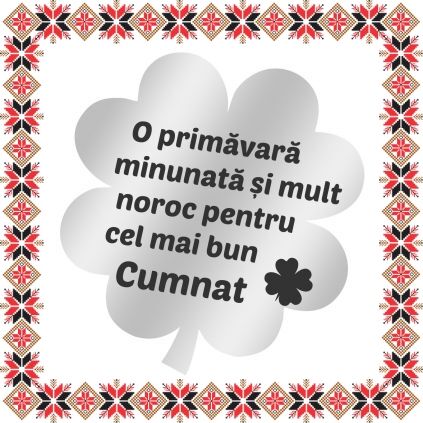 Martisor tip brosa gravata cu trifoi si mesajul O primavara minunata si mult noroc pentru cel mai bun cumnat, pe baza in forma de trifoi cu patru foi de culoare argintie. Martisor realizat din otel inoxidabil, un material rezistent ce nu isi modifica aspectul sau culoarea in timp, aspect ce face din acest martisor un accesoriu extrem de versatil, usor de asortat mai multor tinute vestimentare ce poate fi purtat si dupa sezonul de martisor atat pentru prinderea esarfei cat si ca accesoriu pe reverul sacoului/ paltonului sau pe geanta/ rucsac. Gravam cu bucurie martisoare special create pentru oamenii dragi din viata ta!