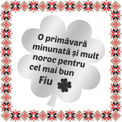 Martisor tip brosa gravata cu trifoi si mesajul O primavara minunata si mult noroc pentru cel mai bun fiu, pe baza in forma de trifoi cu patru foi de culoare argintie. Martisor realizat din otel inoxidabil, un material rezistent ce nu isi modifica aspectul sau culoarea in timp, aspect ce face din acest martisor un accesoriu extrem de versatil, usor de asortat mai multor tinute vestimentare ce poate fi purtat si dupa sezonul de martisor atat pentru prinderea esarfei cat si ca accesoriu pe reverul sacoului/ paltonului sau pe geanta/ rucsac. Gravam cu bucurie martisoare special create pentru oamenii dragi din viata ta!