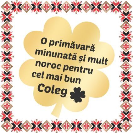 Martisor tip brosa gravata cu trifoi si mesajul O primavara minunata si mult noroc pentru cel mai bun coleg, pe baza in forma de trifoi cu patru foi de culoare aurie. Martisor realizat din otel inoxidabil, un material rezistent ce nu isi modifica aspectul sau culoarea in timp, aspect ce face din acest martisor un accesoriu extrem de versatil, usor de asortat mai multor tinute vestimentare ce poate fi purtat si dupa sezonul de martisor atat pentru prinderea esarfei cat si ca accesoriu pe reverul sacoului/ paltonului sau pe geanta/ rucsac. Gravam cu bucurie martisoare special create pentru oamenii dragi din viata ta!