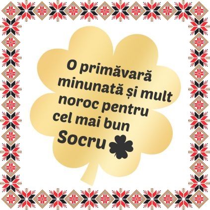 Martisor tip brosa gravata cu trifoi si mesajul O primavara minunata si mult noroc pentru cel mai bun socru, pe baza in forma de trifoi cu patru foi de culoare aurie. Martisor realizat din otel inoxidabil, un material rezistent ce nu isi modifica aspectul sau culoarea in timp, aspect ce face din acest martisor un accesoriu extrem de versatil, usor de asortat mai multor tinute vestimentare ce poate fi purtat si dupa sezonul de martisor atat pentru prinderea esarfei cat si ca accesoriu pe reverul sacoului/ paltonului sau pe geanta/ rucsac. Gravam cu bucurie martisoare special create pentru oamenii dragi din viata ta!