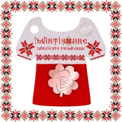 Martisor ambalat pe suport de carton de culoare bej in forma de camasa ie romaneasca cu motive traditionale, catifea rosie si mesajul Daruieste primavara. Snur de martisor si plic de hartie imprimat cu motive traditionale romanesti CADOU!