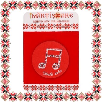 Martisor Brosa Vorba Dulce realizat din lemn cu desen note muzicale din motive traditionale romanesti pe fundal rosu. Pentru ca muzica e vorba dulce si vorba dulce e muzica pentru suflet, am creat un martisor care canta despre primavara! Daruieste muzica de martisor! Daruieste martisoare traditionale romanesti!
