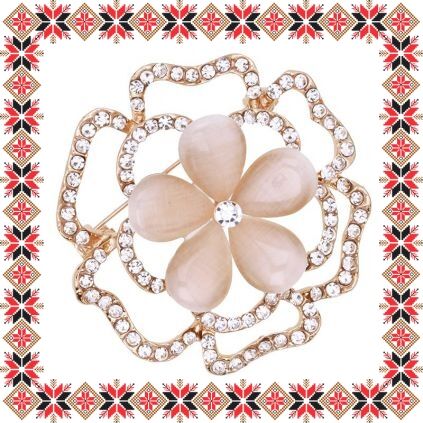 Martisor tip brosa in forma de floare stralucitoare eleganta realizata din pietre cat eye bej si pietricele multifatetate transparente pe baza metalica aurie. Brosa cu sistem de prindere tip agrafa. Daruieste eleganta de martisor!