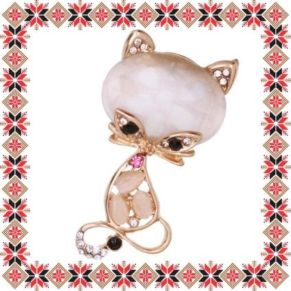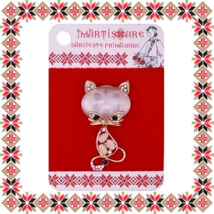 Martisor tip brosa in forma de pisicuta formand semnul infinit cu coada, realizata din pietricele multifatetate transparente si pietre cat eye bej pe baza metalica aurie. Brosa cu sistem de prindere tip agrafa. Daruieste eleganta de martisor!