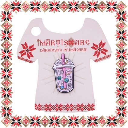 Martisor brosa tip pin in forma de pahar cu pai, norisori, semiluna, stele si planete, realizat in nuante de roz pe baza metalica gun metal. Brosele au devenit in ultimii ani extrem de populare si reprezinta un accesoriu prin care purtatorii isi pot manifesta sentimentele si isi pot expune lumii, personalitatea, pasiunile si preferintele. Martisoarele brose colorate au un aspect prietenos si calduros, ceea ce le face extrem de versatile si usor de asortat mai multor tinute vestimentare. Martisorul poate fi purtat ca brosa dupa sezonul de martisor atat pentru prinderea esarfei cat si ca accesoriu pe reverul sacoului/ paltonului sau pe geanta/ rucsac. Daruieste martisoare cu personalitate persoanelor dragi din viata ta!