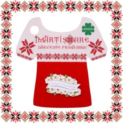 Martisor ambalat pe suport de carton de culoare bej in forma de camasa ie romaneasca cu catifea rosie si motive traditionale si mesajul Daruieste primavara.