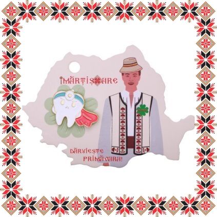 Martisor ambalat pe suport de carton de culoare bej reprezentand Harta Romaniei cu motive traditionale si mesajul Daruieste primavara.