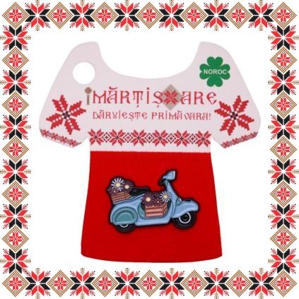 Martisor brosa tip pin in forma de scooter cu ladite cu flori, realizata in nuante de bleu si bej pe baza metalica neagra. Brosele au devenit in ultimii ani extrem de populare si reprezinta un accesoriu prin care purtatorii isi pot manifesta sentimentele si isi pot expune lumii, personalitatea, pasiunile si preferintele. Martisoarele brose colorate au un aspect prietenos si calduros, ceea ce le face extrem de versatile si usor de asortat mai multor tinute vestimentare. Martisorul poate fi purtat ca brosa dupa sezonul de martisor atat pentru prinderea esarfei cat si ca accesoriu pe reverul sacoului/ paltonului sau pe geanta/ rucsac.  Daruieste martisoare cu personalitate persoanelor dragi din viata ta!