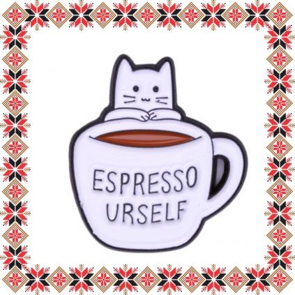 Martisor brosa tip pin in forma de cana cu cafea, pisicuta si mesajul Espresso Urself, realizata cu alb si maro pe baza metalica neagra. Brosele au devenit in ultimii ani extrem de populare si reprezinta un accesoriu prin care purtatorii isi pot manifesta sentimentele si isi pot expune lumii, personalitatea, pasiunile si preferintele. Martisorul poate fi purtat ca brosa dupa sezonul de martisor atat pentru prinderea esarfei cat si ca accesoriu pe reverul sacoului/ paltonului sau pe geanta/ rucsac. Daruieste martisoare cu personalitate persoanelor dragi din viata ta!