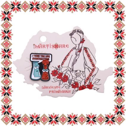 Martisor brosa tip pin cu mesajul I think you are overreacting si doua eprubete, realizata cu bleu si portocaliu pe baza metalica neagra. Brosele au devenit in ultimii ani extrem de populare si reprezinta un accesoriu prin care purtatorii isi pot manifesta sentimentele si isi pot expune lumii, personalitatea, pasiunile si preferintele. Martisoarele brose colorate au un aspect prietenos si calduros, ceea ce le face extrem de versatile si usor de asortat mai multor tinute vestimentare. Martisorul poate fi purtat ca brosa dupa sezonul de martisor atat pentru prinderea esarfei cat si ca accesoriu pe reverul sacoului/ paltonului sau pe geanta/ rucsac. Daruieste martisoare cu personalitate persoanelor dragi din viata ta!