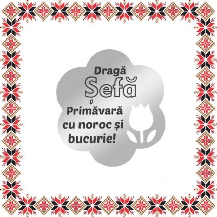 Brosa martisor in forma de floare cu perforatie lalea, realizata din inox de culoare argintie, gravata cu mesajul Draga Sefa, primavara cu noroc si bucurie! Daruieste martisoare personalizate odata cu venirea primaverii! Alege un martisor realizat din otel inoxidabil pentru ca primitoarea il va putea purta tot anul fara sa isi schimbe aspectul sau culoarea, daruieste zambete!
