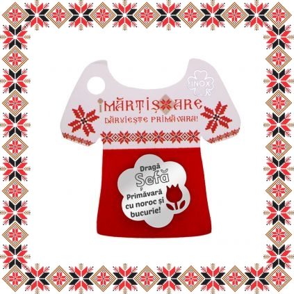 Martisor ambalat pe suport de carton in forma de ie romaneasca cu catifea rosie si motive traditionale romanesti. Martisorul este insotit de plic de hartie imprimat cu motive traditionale romanesti si snur de martisor. Deasemenea veti primi alaturi de martisor bucuria cu care noi l-am creat, tot ce trebuie sa faceti este sa adaugati bucuria daruirii si sa il oferiti persoanei dragi impreuna cu primavara!