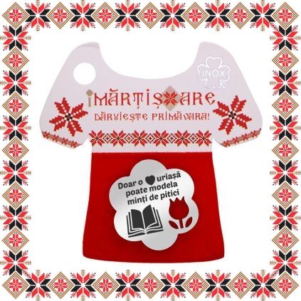 Martisor ambalat pe suport de carton in forma de ie romaneasca cu catifea rosie si motive traditionale romanesti. Martisorul este insotit de plic de hartie imprimat cu motive traditionale romanesti si snur de martisor. Deasemenea veti primi alaturi de martisor bucuria cu care noi l-am creat, tot ce trebuie sa faceti este sa adaugati bucuria daruirii si sa il oferiti persoanei dragi impreuna cu primavara!