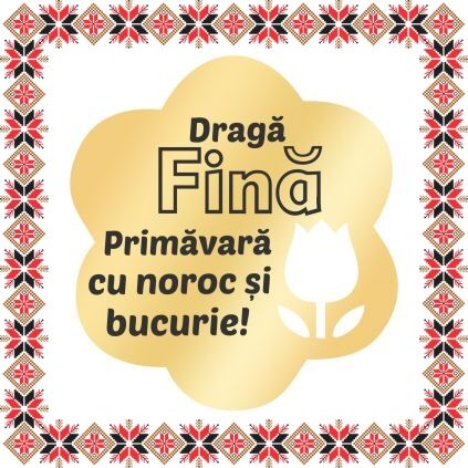 Brosa martisor in forma de floare cu perforatie lalea, realizata din inox de culoare aurie, gravata cu mesajul Draga Fina, primavara cu noroc si bucurie! Daruieste martisoare personalizate odata cu venirea primaverii! Alege un martisor realizat din otel inoxidabil pentru ca primitoarea il va putea purta tot anul fara sa isi schimbe aspectul sau culoarea, daruieste zambete!