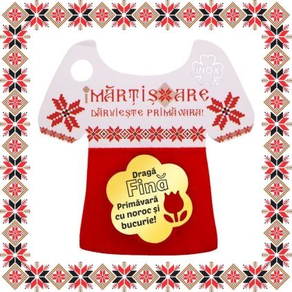 Martisor ambalat pe suport de carton in forma de ie romaneasca cu catifea rosie si motive traditionale romanesti. Martisorul este insotit de plic de hartie imprimat cu motive traditionale romanesti si snur de martisor. Deasemenea veti primi alaturi de martisor bucuria cu care noi l-am creat, tot ce trebuie sa faceti este sa adaugati bucuria daruirii si sa il oferiti persoanei dragi impreuna cu primavara!