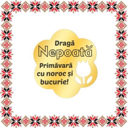 Brosa martisor in forma de floare cu perforatie lalea, realizata din inox de culoare aurie, gravata cu mesajul Draga Nepoata, primavara cu noroc si bucurie! Daruieste martisoare personalizate odata cu venirea primaverii! Alege un martisor realizat din otel inoxidabil pentru ca primitoarea il va putea purta tot anul fara sa isi schimbe aspectul sau culoarea, daruieste zambete!