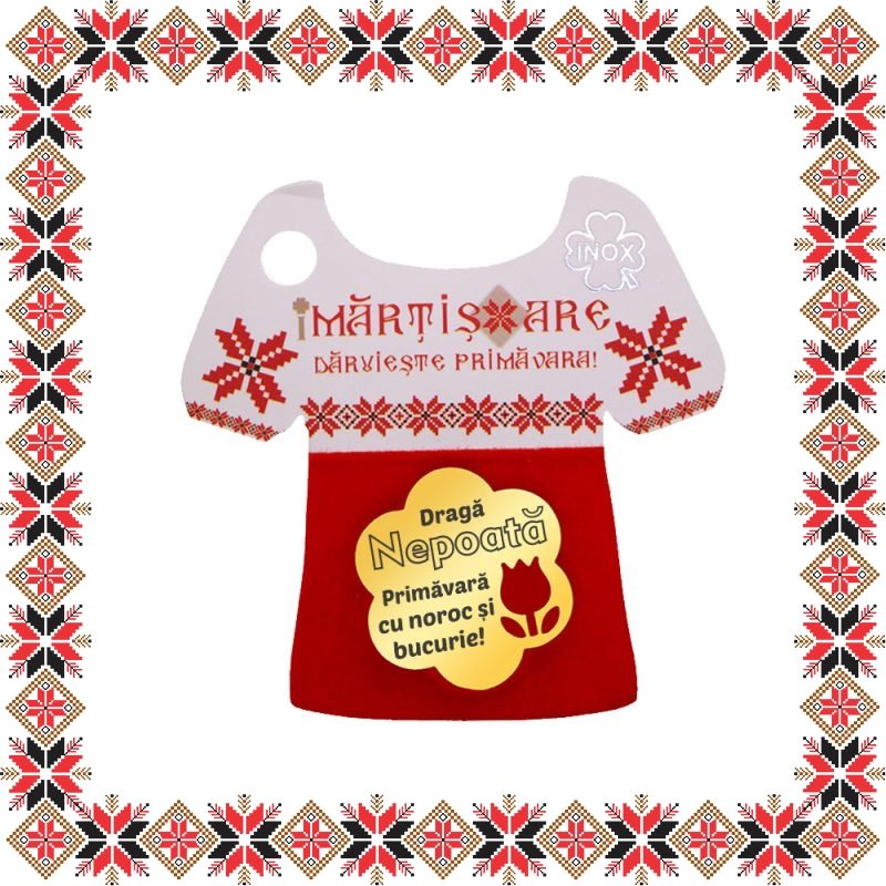 Martisor ambalat pe suport de carton in forma de ie romaneasca cu catifea rosie si motive traditionale romanesti. Martisorul este insotit de plic de hartie imprimat cu motive traditionale romanesti si snur de martisor. Deasemenea veti primi alaturi de martisor bucuria cu care noi l-am creat, tot ce trebuie sa faceti este sa adaugati bucuria daruirii si sa il oferiti persoanei dragi impreuna cu primavara!