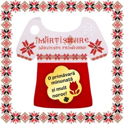 Martisor ambalat pe suport de carton in forma de ie romaneasca cu catifea rosie si motive traditionale romanesti. Martisorul este insotit de plic de hartie imprimat cu motive traditionale romanesti si snur de martisor. Deasemenea veti primi alaturi de martisor bucuria cu care noi l-am creat, tot ce trebuie sa faceti este sa adaugati bucuria daruirii si sa il oferiti persoanei dragi impreuna cu primavara!