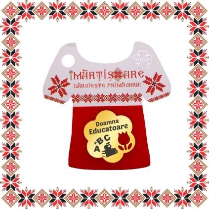 Martisor ambalat pe suport de carton in forma de ie romaneasca cu catifea rosie si motive traditionale romanesti. Martisorul este insotit de plic de hartie imprimat cu motive traditionale romanesti si snur de martisor. Deasemenea veti primi alaturi de martisor bucuria cu care noi l-am creat, tot ce trebuie sa faceti este sa adaugati bucuria daruirii si sa il oferiti persoanei dragi impreuna cu primavara!