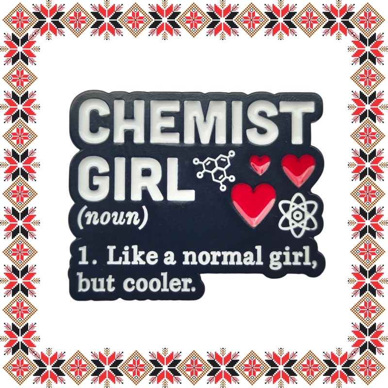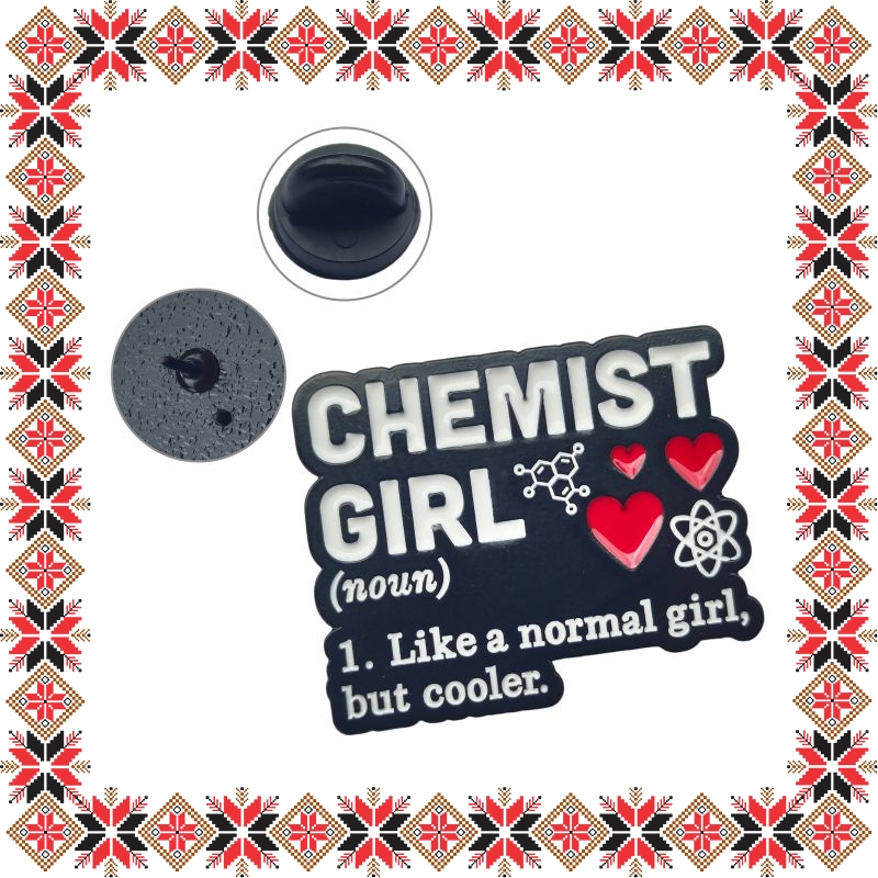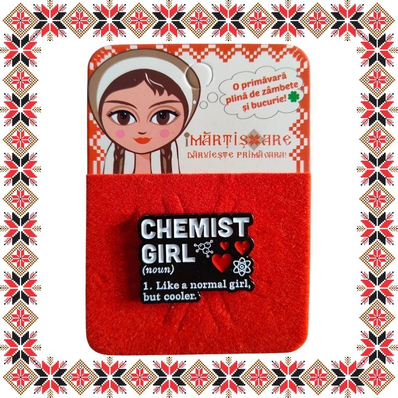 Martisor brosa tip pin pentru profesori, chimisti si studenti la chimie, cu mesajul Chemist girl - Like a normal girl, but cooler. Pinurile au devenit in ultimii ani extrem de populare si reprezinta un accesoriu prin care purtatorii isi pot manifesta sentimentele si isi pot expune lumii, personalitatea, pasiunile si preferintele. Martisorul poate fi purtat ca brosa dupa sezonul de martisor atat pentru prinderea esarfei cat si ca accesoriu pe reverul sacoului/ paltonului sau pe geanta/ rucsac. Daruieste un martisor deosebit care sa i se potriveasca perfect!