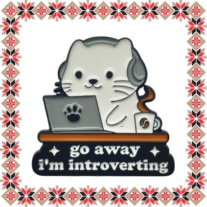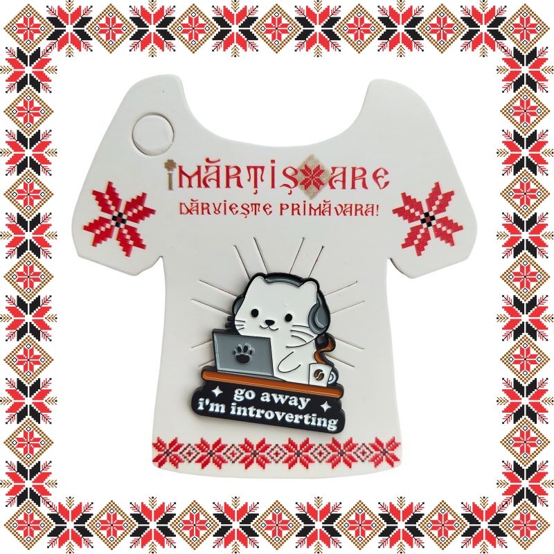Martisor brosa tip pin pentru colega mereu cu castile pe urechi, in forma de pisicuta la laptop cu mesajul Go away, I'm introverting.Pinurile au devenit in ultimii ani extrem de populare si reprezinta un accesoriu prin care purtatorii isi pot manifesta sentimentele si isi pot expune lumii, personalitatea, pasiunile si preferintele. Martisoarele brose colorate au un aspect prietenos si calduros, ceea ce le face extrem de versatile si usor de asortat mai multor tinute vestimentare. Martisorul poate fi purtat ca brosa dupa sezonul de martisor atat pentru prinderea esarfei cat si ca accesoriu pe reverul sacoului/ paltonului sau pe geanta/ rucsac. Daruieste martisoare cu personalitate persoanelor dragi din viata ta!