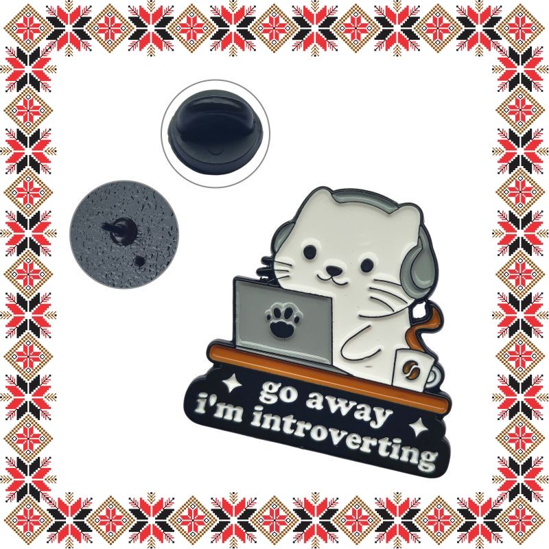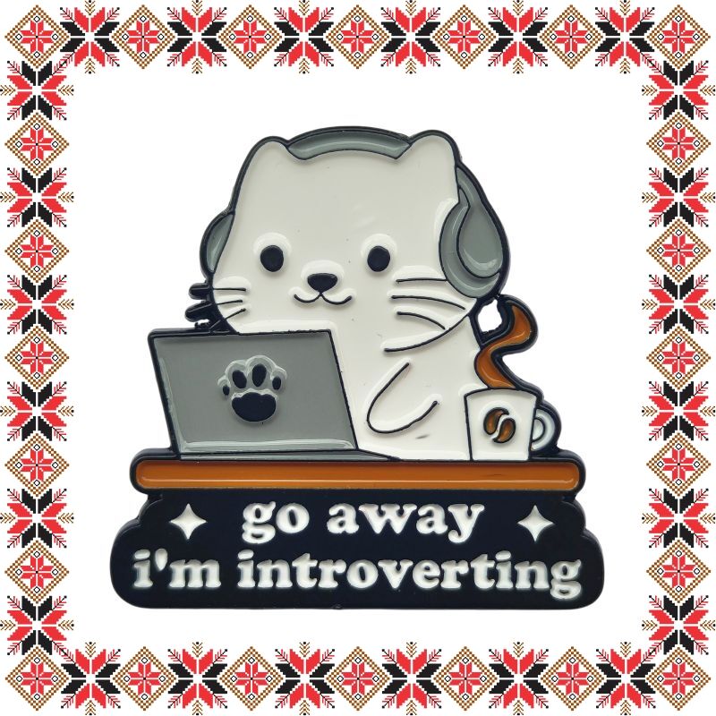 Martisor brosa tip pin pentru colega mereu cu castile pe urechi, in forma de pisicuta la laptop cu mesajul Go away, I'm introverting. Pinurile au devenit in ultimii ani extrem de populare si reprezinta un accesoriu prin care purtatorii isi pot manifesta sentimentele si isi pot expune lumii, personalitatea, pasiunile si preferintele. Martisorul poate fi purtat ca brosa dupa sezonul de martisor atat pentru prinderea esarfei cat si ca accesoriu pe reverul sacoului/ paltonului sau pe geanta/ rucsac. Daruieste un martisor deosebit care sa i se potriveasca perfect!