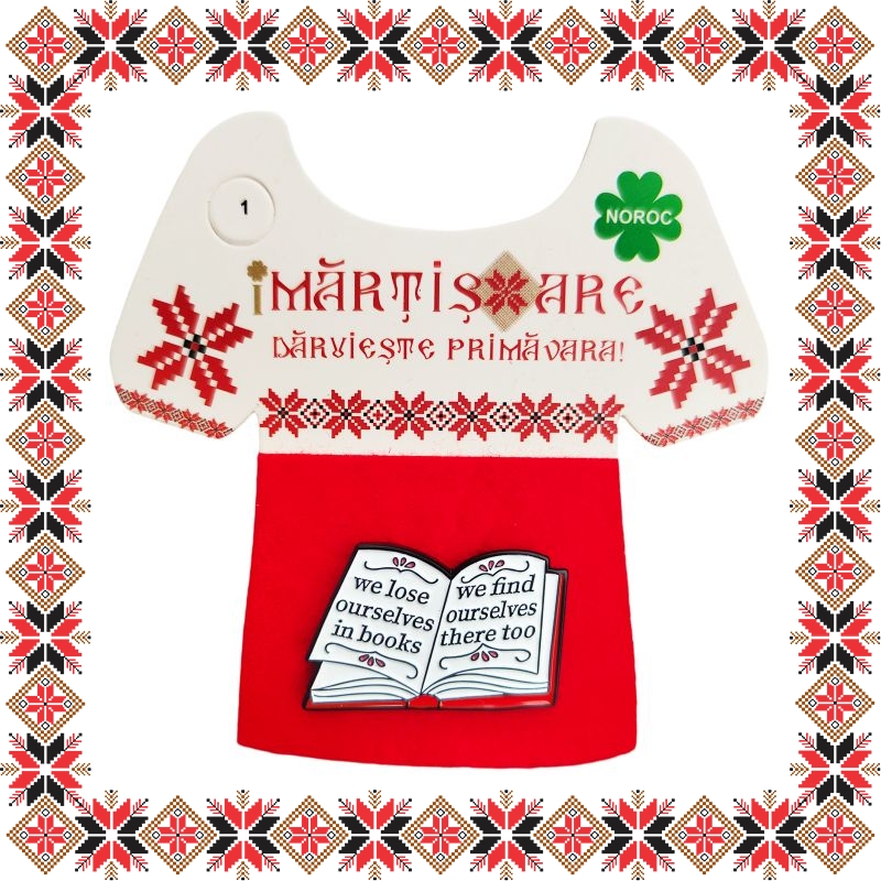 Martisor brosa tip pin pentru pasionatele de citit, in forma de carte si mesajul We lose ourselves in books We find ourselves there too. Pinurile au devenit in ultimii ani extrem de populare si reprezinta un accesoriu prin care purtatorii isi pot manifesta sentimentele si isi pot expune lumii, personalitatea, pasiunile si preferintele. Martisoarele brose colorate au un aspect prietenos si calduros, ceea ce le face extrem de versatile si usor de asortat mai multor tinute vestimentare. Martisorul poate fi purtat ca brosa dupa sezonul de martisor atat pentru prinderea esarfei cat si ca accesoriu pe reverul sacoului/ paltonului sau pe geanta/ rucsac. Daruieste martisoare cu personalitate persoanelor dragi din viata ta!