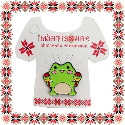 Martisor brosa tip pin pentru instrumentisti si muzicieni, in forma de broscuta cantand la maracas. Pinurile au devenit in ultimii ani extrem de populare si reprezinta un accesoriu prin care purtatorii isi pot manifesta sentimentele si isi pot expune lumii, personalitatea, pasiunile si preferintele. Martisoarele brose colorate au un aspect prietenos si calduros, ceea ce le face extrem de versatile si usor de asortat mai multor tinute vestimentare. Martisorul poate fi purtat ca brosa dupa sezonul de martisor atat pentru prinderea esarfei cat si ca accesoriu pe reverul sacoului/ paltonului sau pe geanta/ rucsac. Daruieste martisoare cu personalitate persoanelor dragi din viata ta!