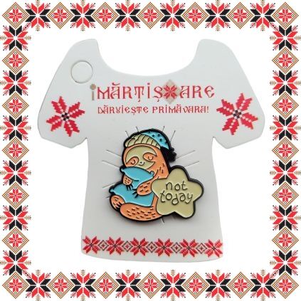 Martisor brosa tip pin pentru momente de relaxare petrecute intr-o pijama pufoasa sub o patura, in forma de lenes cu perna si steluta. Pinurile au devenit in ultimii ani extrem de populare si reprezinta un accesoriu prin care purtatorii isi pot manifesta sentimentele si isi pot expune lumii, personalitatea, pasiunile si preferintele. Martisoarele brose colorate au un aspect prietenos si calduros, ceea ce le face extrem de versatile si usor de asortat mai multor tinute vestimentare. Martisorul poate fi purtat ca brosa dupa sezonul de martisor atat pentru prinderea esarfei cat si ca accesoriu pe reverul sacoului/ paltonului sau pe geanta/ rucsac. Daruieste martisoare cu personalitate persoanelor dragi din viata ta!