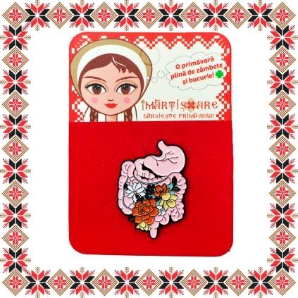 Martisor brosa tip pin pentru medicii gastroenterologi dar si pentru nutritionisti, reprezentand sistemul digestiv ornat cu flori colorate. Pinurile au devenit in ultimii ani extrem de populare si reprezinta un accesoriu prin care purtatorii isi pot manifesta sentimentele si isi pot expune lumii, personalitatea, pasiunile si preferintele. Martisoarele brose colorate au un aspect prietenos si calduros, ceea ce le face extrem de versatile si usor de asortat mai multor tinute vestimentare. Martisorul poate fi purtat ca brosa dupa sezonul de martisor atat pentru prinderea esarfei cat si ca accesoriu pe reverul sacoului/ paltonului sau pe geanta/ rucsac. Daruieste martisoare cu personalitate persoanelor dragi din viata ta!