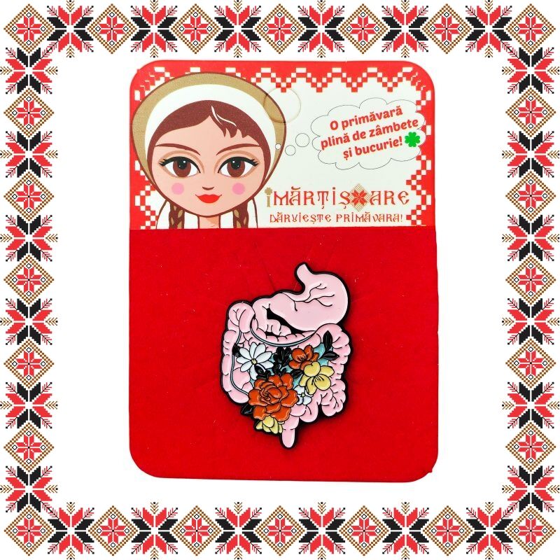 Martisor brosa tip pin pentru medicii gastroenterologi dar si pentru nutritionisti, reprezentand sistemul digestiv ornat cu flori colorate. Pinurile au devenit in ultimii ani extrem de populare si reprezinta un accesoriu prin care purtatorii isi pot manifesta sentimentele si isi pot expune lumii, personalitatea, pasiunile si preferintele. Martisorul poate fi purtat ca brosa dupa sezonul de martisor atat pentru prinderea esarfei cat si ca accesoriu pe reverul sacoului/ paltonului sau pe geanta/ rucsac. Daruieste un martisor deosebit care sa i se potriveasca perfect!