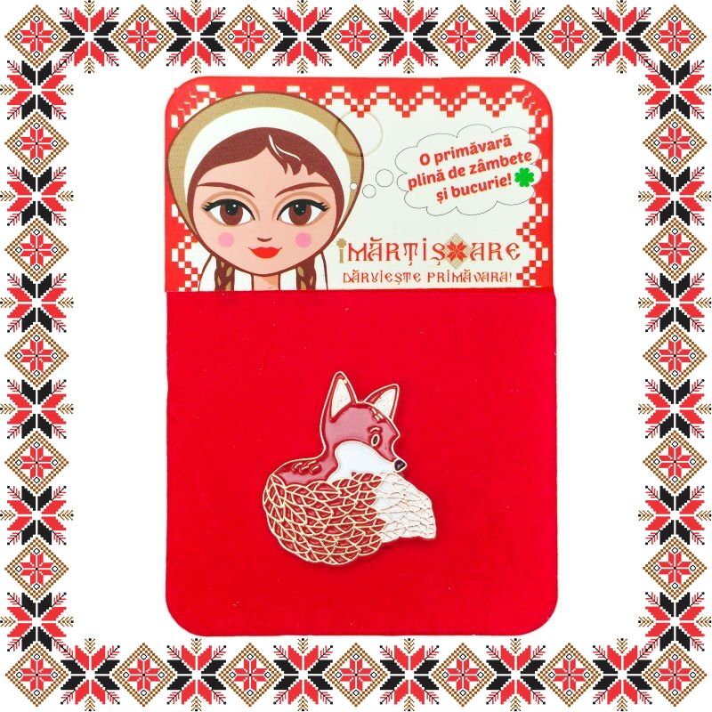 Martisor brosa tip pin pentru doamnele mereu elegante si rasfatate, in forma de vulpita cu coada stufoasa cu model filigran.Pinurile au devenit in ultimii ani extrem de populare si reprezinta un accesoriu prin care purtatorii isi pot manifesta sentimentele si isi pot expune lumii, personalitatea, pasiunile si preferintele. Martisoarele brose colorate au un aspect prietenos si calduros, ceea ce le face extrem de versatile si usor de asortat mai multor tinute vestimentare. Martisorul poate fi purtat ca brosa dupa sezonul de martisor atat pentru prinderea esarfei cat si ca accesoriu pe reverul sacoului/ paltonului sau pe geanta/ rucsac. Daruieste martisoare cu personalitate persoanelor dragi din viata ta!