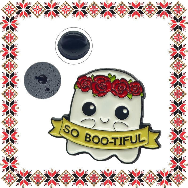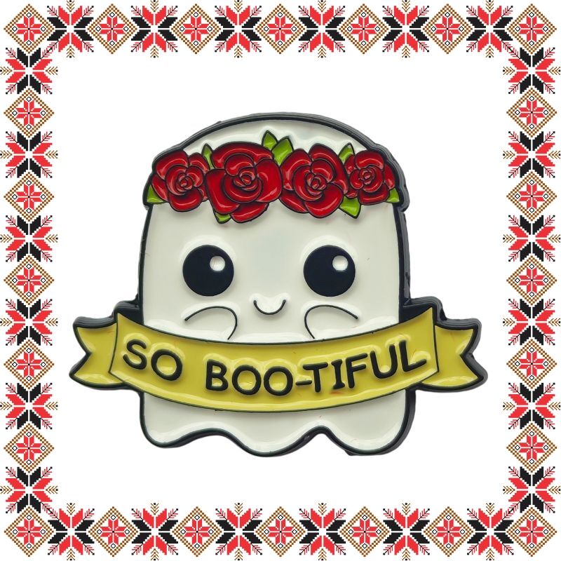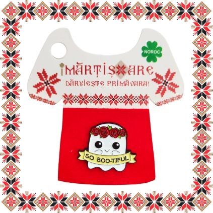 Martisor brosa tip pin pentru cele carora si lucrurile infricosatoare li se par cute, in forma de fantoma cu flori si mesajul So bootiful. Pinurile au devenit in ultimii ani extrem de populare si reprezinta un accesoriu prin care purtatorii isi pot manifesta sentimentele si isi pot expune lumii, personalitatea, pasiunile si preferintele. Martisorul poate fi purtat ca brosa dupa sezonul de martisor atat pentru prinderea esarfei cat si ca accesoriu pe reverul sacoului/ paltonului sau pe geanta/ rucsac. Daruieste un martisor deosebit care sa i se potriveasca perfect!