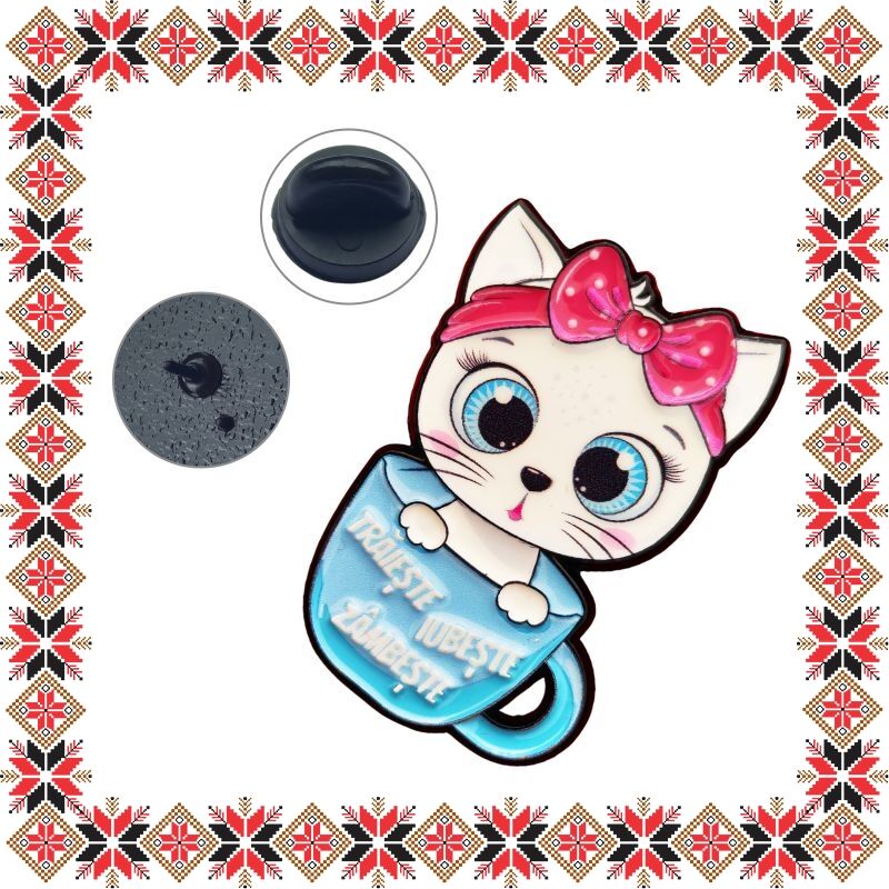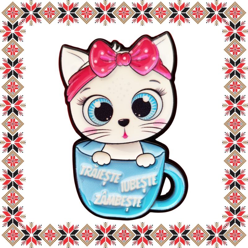 Martisor brosa tip pin pentru o doza de rasfat si bucurie, in forma de pisica mirata intr-o cana si mesajul Traieste Iubeste Zambeste. Pinurile au devenit in ultimii ani extrem de populare si reprezinta un accesoriu prin care purtatorii isi pot manifesta sentimentele si isi pot expune lumii, personalitatea, pasiunile si preferintele. Martisorul poate fi purtat ca brosa dupa sezonul de martisor atat pentru prinderea esarfei cat si ca accesoriu pe reverul sacoului/ paltonului sau pe geanta/ rucsac.  Daruieste un martisor deosebit care sa i se potriveasca perfect!
