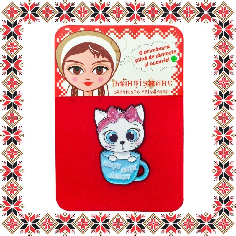 Martisor brosa tip pin pentru o doza de rasfat si bucurie, in forma de pisica mirata intr-o cana si mesajul Traieste Iubeste Zambeste. Pinurile au devenit in ultimii ani extrem de populare si reprezinta un accesoriu prin care purtatorii isi pot manifesta sentimentele si isi pot expune lumii, personalitatea, pasiunile si preferintele. Martisoarele brose colorate au un aspect prietenos si calduros, ceea ce le face extrem de versatile si usor de asortat mai multor tinute vestimentare. Martisorul poate fi purtat ca brosa dupa sezonul de martisor atat pentru prinderea esarfei cat si ca accesoriu pe reverul sacoului/ paltonului sau pe geanta/ rucsac.  Daruieste martisoare cu personalitate persoanelor dragi din viata ta!