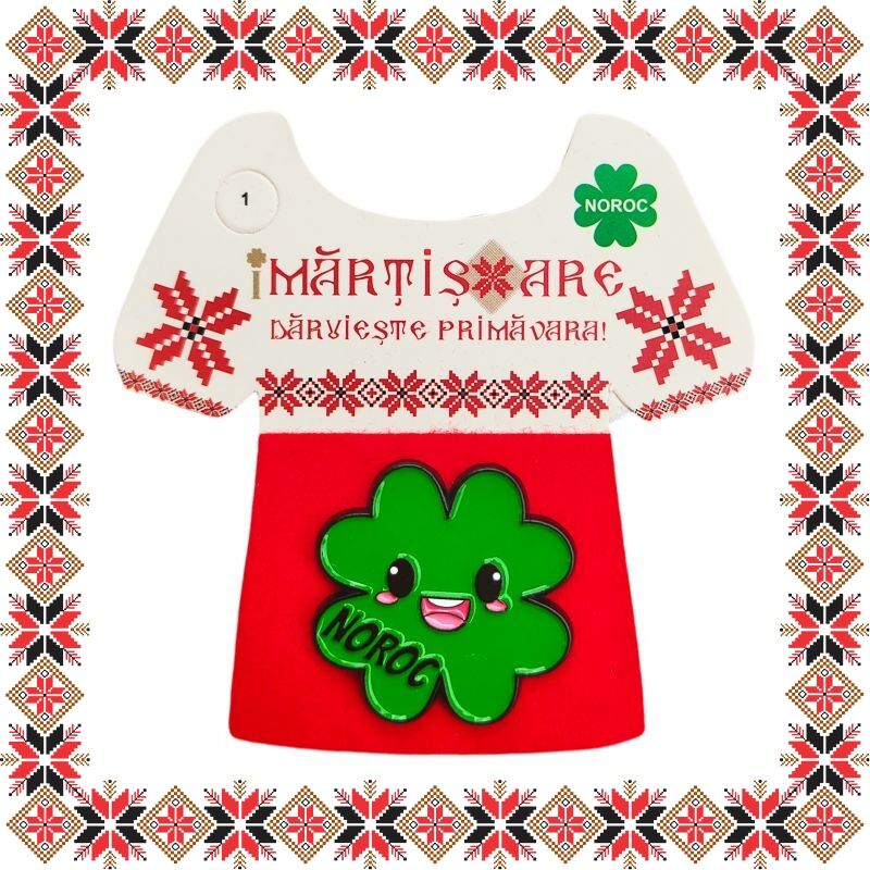 Martisor brosa tip pin pentru a darui noroc si voie buna, reprezentand un trifoi cu patru foi zambaret si mesajul Noroc.Pinurile au devenit in ultimii ani extrem de populare si reprezinta un accesoriu prin care purtatorii isi pot manifesta sentimentele si isi pot expune lumii, personalitatea, pasiunile si preferintele. Martisoarele brose colorate au un aspect prietenos si calduros, ceea ce le face extrem de versatile si usor de asortat mai multor tinute vestimentare. Martisorul poate fi purtat ca brosa dupa sezonul de martisor atat pentru prinderea esarfei cat si ca accesoriu pe reverul sacoului/ paltonului sau pe geanta/ rucsac.  Daruieste martisoare cu personalitate persoanelor dragi din viata ta!