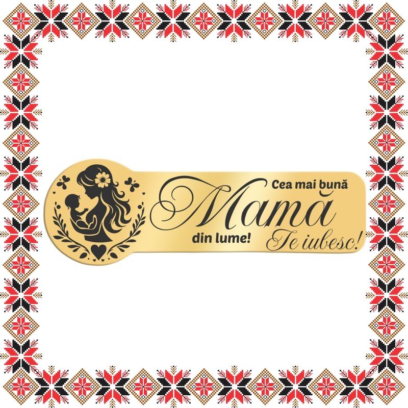 Martisor brosa tip ecuson auriu din inox personalizat prin gravura laser cu silueta mamei cu bebelusul ei, flori si fluturi si mesajul Cea mai buna mama din lume! Te iubesc! Daruieste martisoare deosebite, personalizate special pentru oamenii pe care ii iubesti, pe care ii admiri, celor carora vrei sa le multumesti si celor carora vrei sa le transmiti un gand bun odata cu venirea primaverii! Opteaza pentru un martisor realizat din otel inoxidabil pentru ca primitoarea sa il poata purta tot anul.