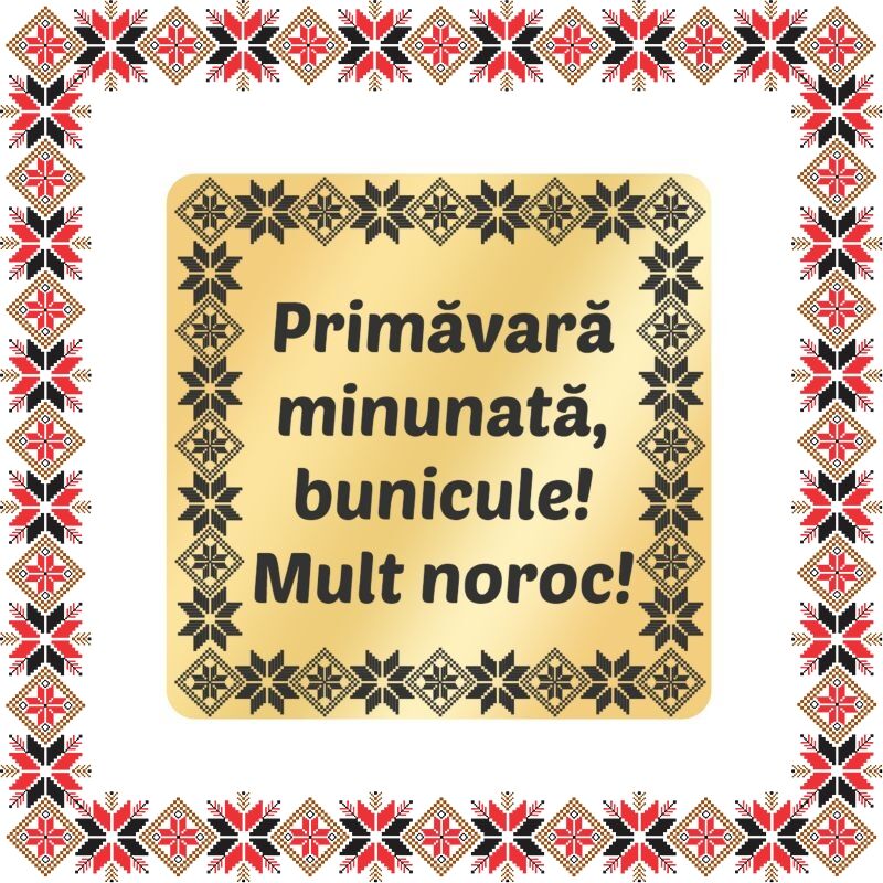 Martisor brosa personalizata - tablou cu motive traditionale pentru bunic. Realizat din inox acoperit PVD cu aur si personalizat prin gravura laser cu rama cu motive si mesajul Primavara minunata, bunicule! Mult noroc! Daruieste martisoare deosebite, personalizate special pentru oamenii pe care ii iubesti, pe care ii admiri, celor carora vrei sa le multumesti si celor carora vrei sa le daruiesti un gand bun odata cu venirea primaverii! Opteaza pentru un martisor realizat din otel inoxidabil pentru ca primitoarea sa il poata purta tot anul.