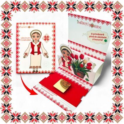 Martisor ambalat premium pe suport de carton tip felicitare 3D de culoare bej cu catifea rosie, tematica inspirata din folclor si stil prietenos, design traditional, stil modern.