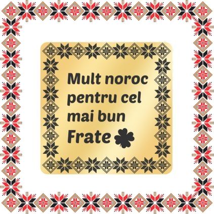 Martisor brosa personalizata - tablou cu motive traditionale pentru frate. Realizat din inox acoperit PVD cu aur si personalizat prin gravura laser cu rama cu motive si mesajul Mult noroc pentru cel mai bun frate! Daruieste martisoare deosebite, personalizate special pentru oamenii pe care ii iubesti, pe care ii admiri, celor carora vrei sa le multumesti si celor carora vrei sa le daruiesti un gand bun odata cu venirea primaverii! Opteaza pentru un martisor realizat din otel inoxidabil pentru ca primitoarea sa il poata purta tot anul.