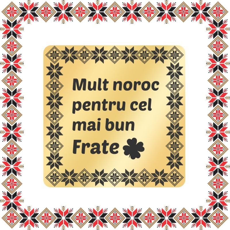 Martisor brosa personalizata - tablou cu motive traditionale pentru frate. Realizat din inox acoperit PVD cu aur si personalizat prin gravura laser cu rama cu motive si mesajul Mult noroc pentru cel mai bun frate! Opteaza pentru un martisor realizat din otel inoxidabil pentru ca primitoarea sa il poata purta tot anul.